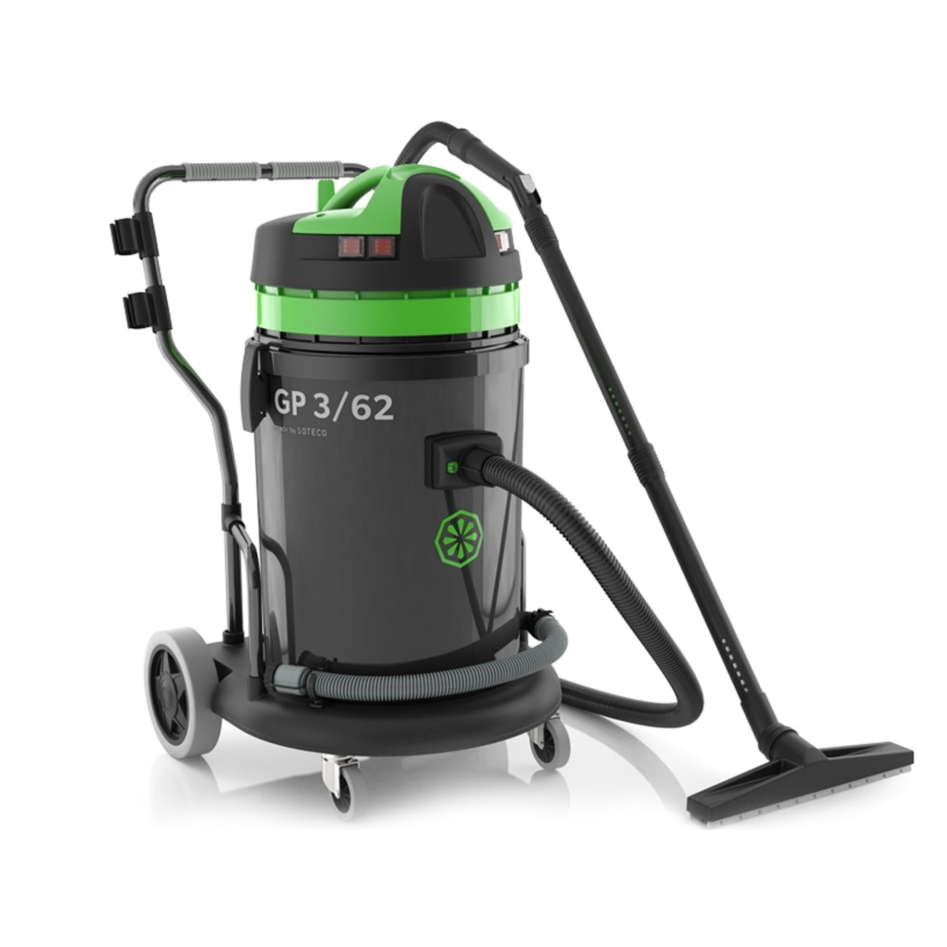 Com três motores de alta velocidade que fornecem uma potência total de 3600W, o GP 3/62 W&D é um dos aspiradores IPC de pós e líquidos mais potentes.