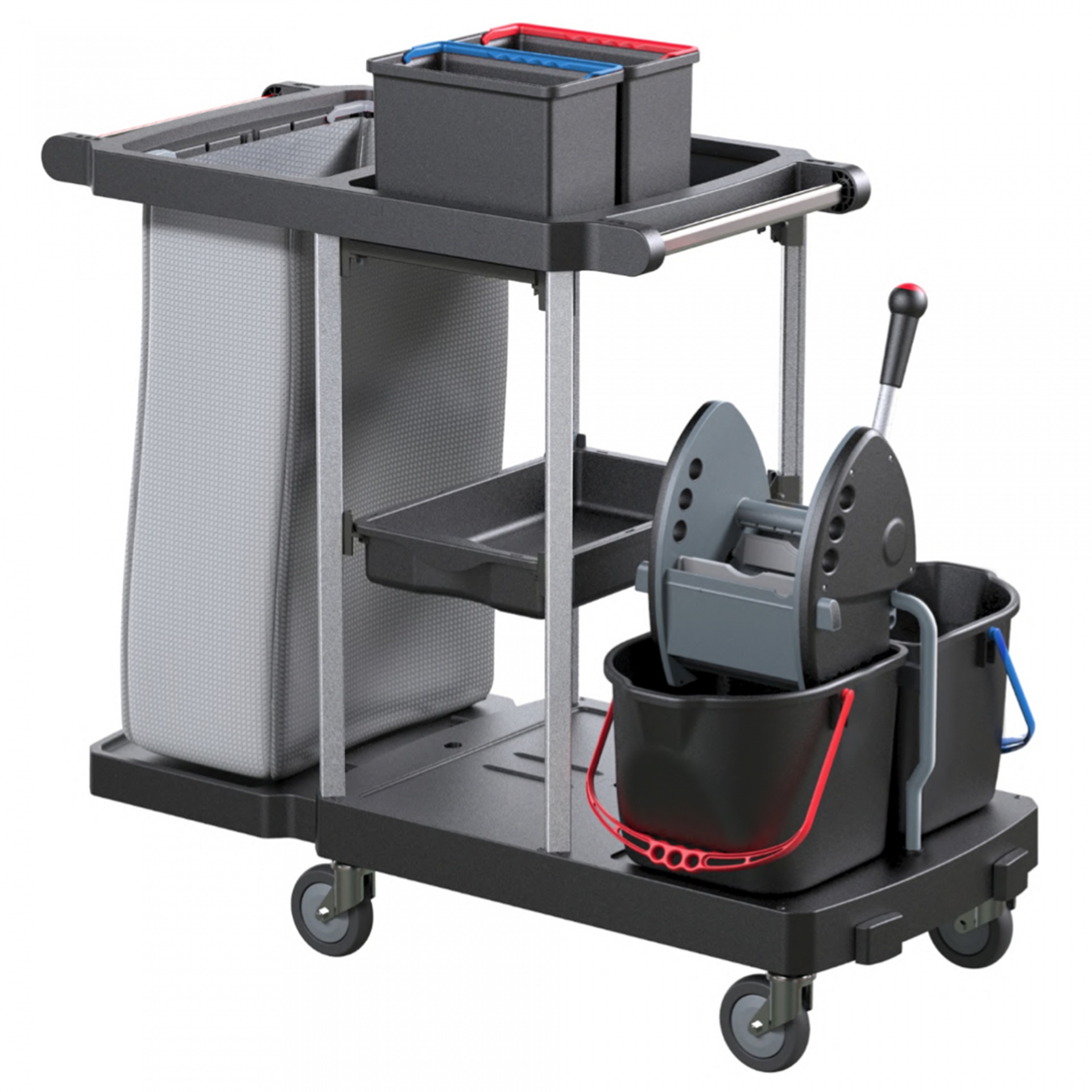 Carro de limpeza e serviço em polipropileno reciclado, com 2 baldes de 15 litros, prensa, 2 baldes de 7 litros, prateleira e suporte para saco plastificado 120 litros.