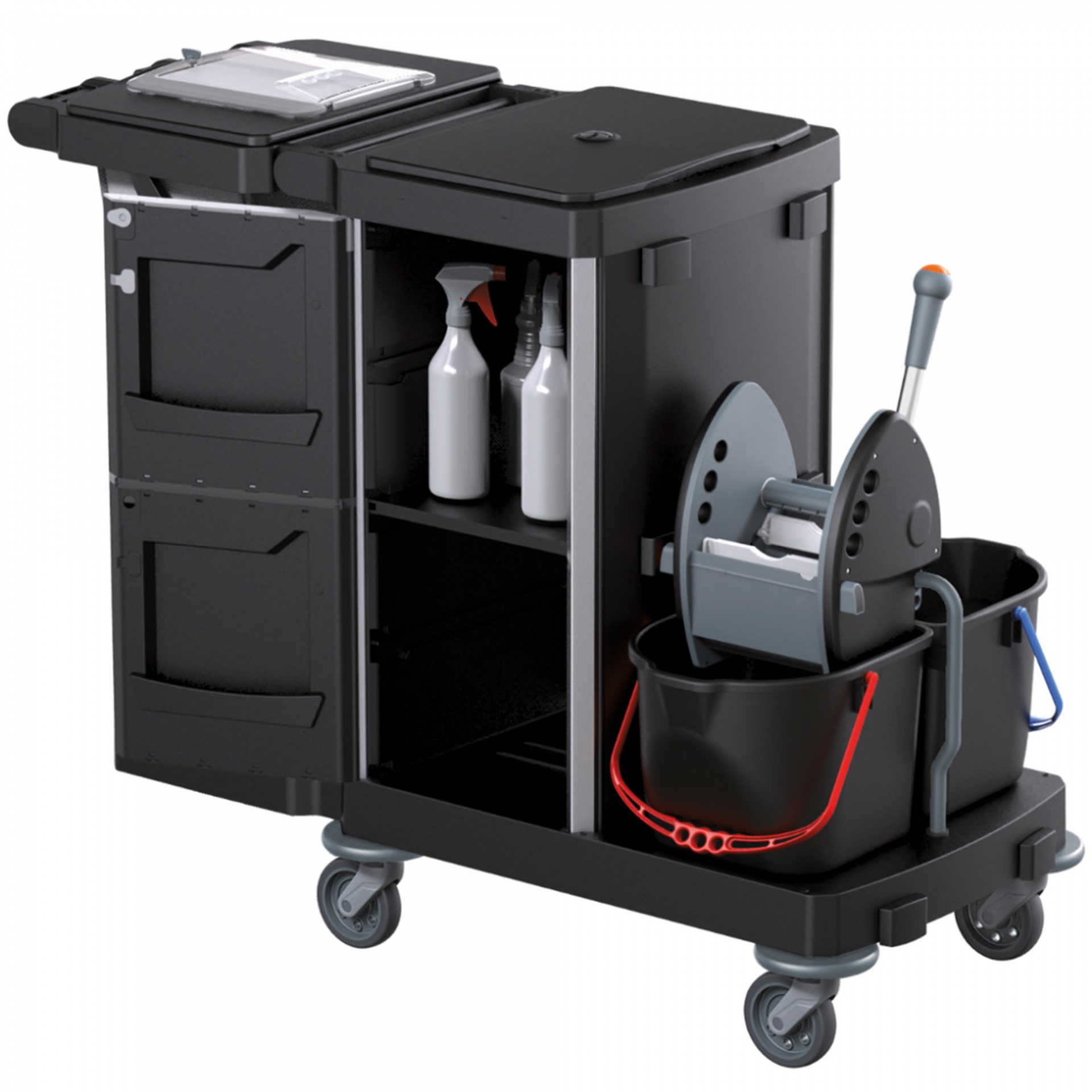 Carro de limpeza e serviço em polipropileno reciclado, com 2 baldes de 15 litros, prensa, prateleiras com porta e suporte para saco plastificado 120 litros.