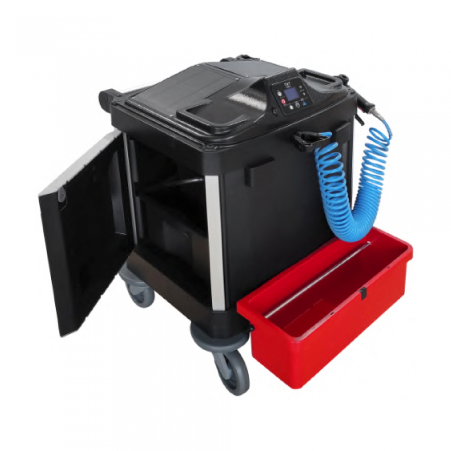 Carro com sistema de pulverização e impregnação de mopas, para desinfeção de superfícies.