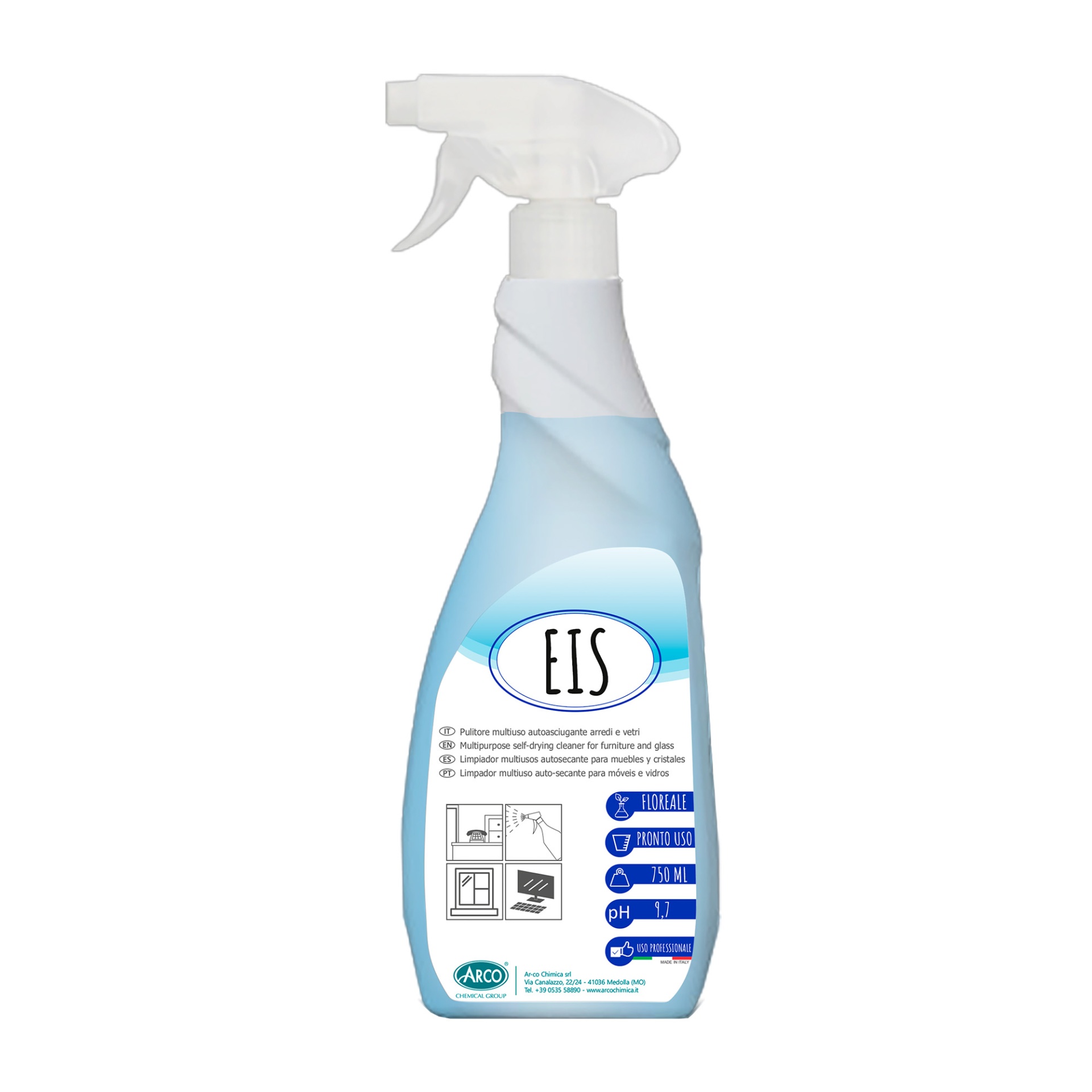 Eis é um detergente com auto-secagem para a limpeza rápida sem enxaguamento de superfícies como: vidros, espelhos, secretárias, laminados plásticos, superfícies laqueadas, interiores de carros, loiça sanitária, etc.