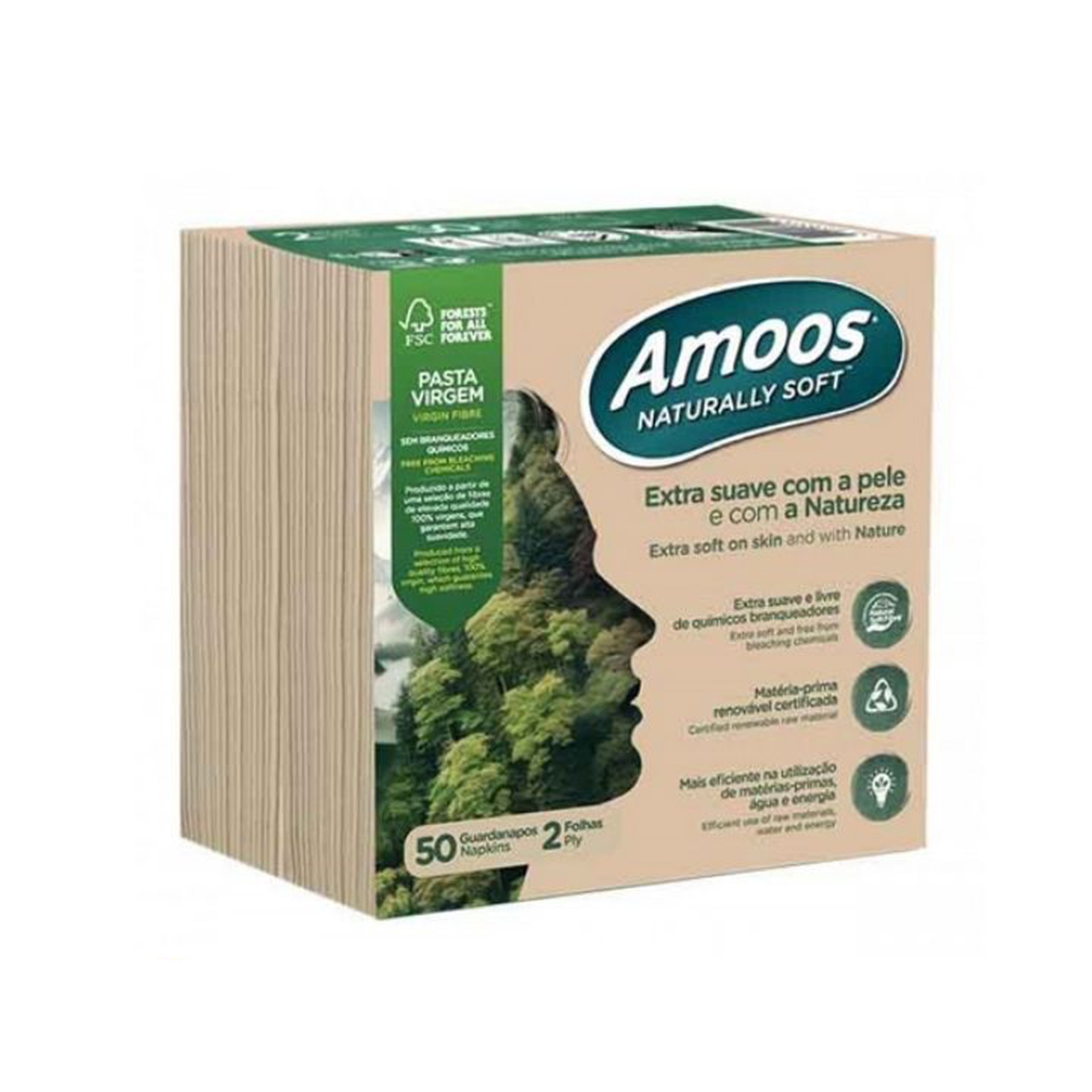 Guardanapo 40×40 com tecnologia P&P, livre de químicos branqueadores, feito a partir de um processo de fabrico otimizado, ecologicamente eficiente na utilização de matérias-primas, madeira, água e energia.