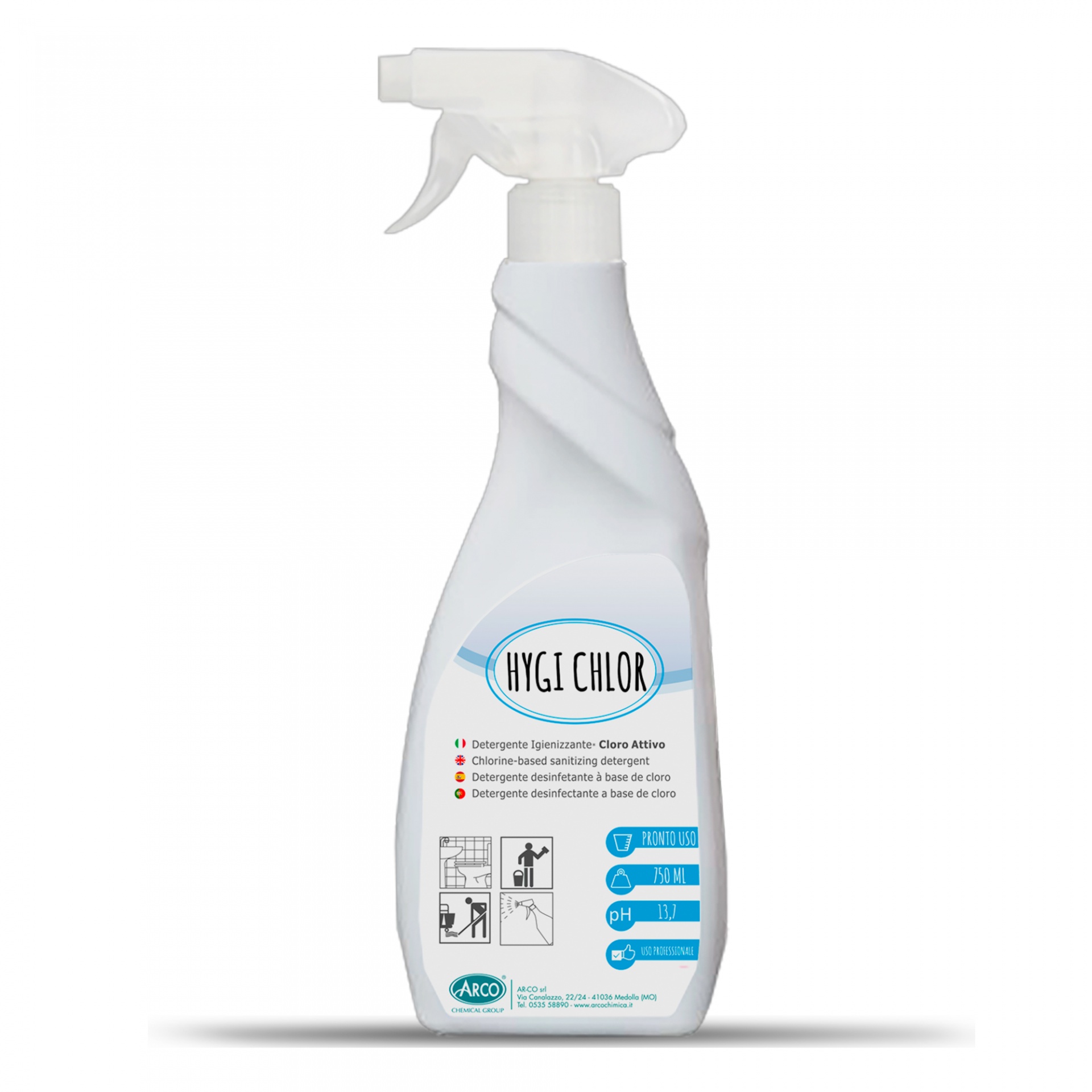 Hygi Chlor é um detergente higienizante à base de cloro activo, com uma acção branqueadora adequada para a limpeza de superfícies duras laváveis e resistentes a agentes branqueadores à base de cloro.