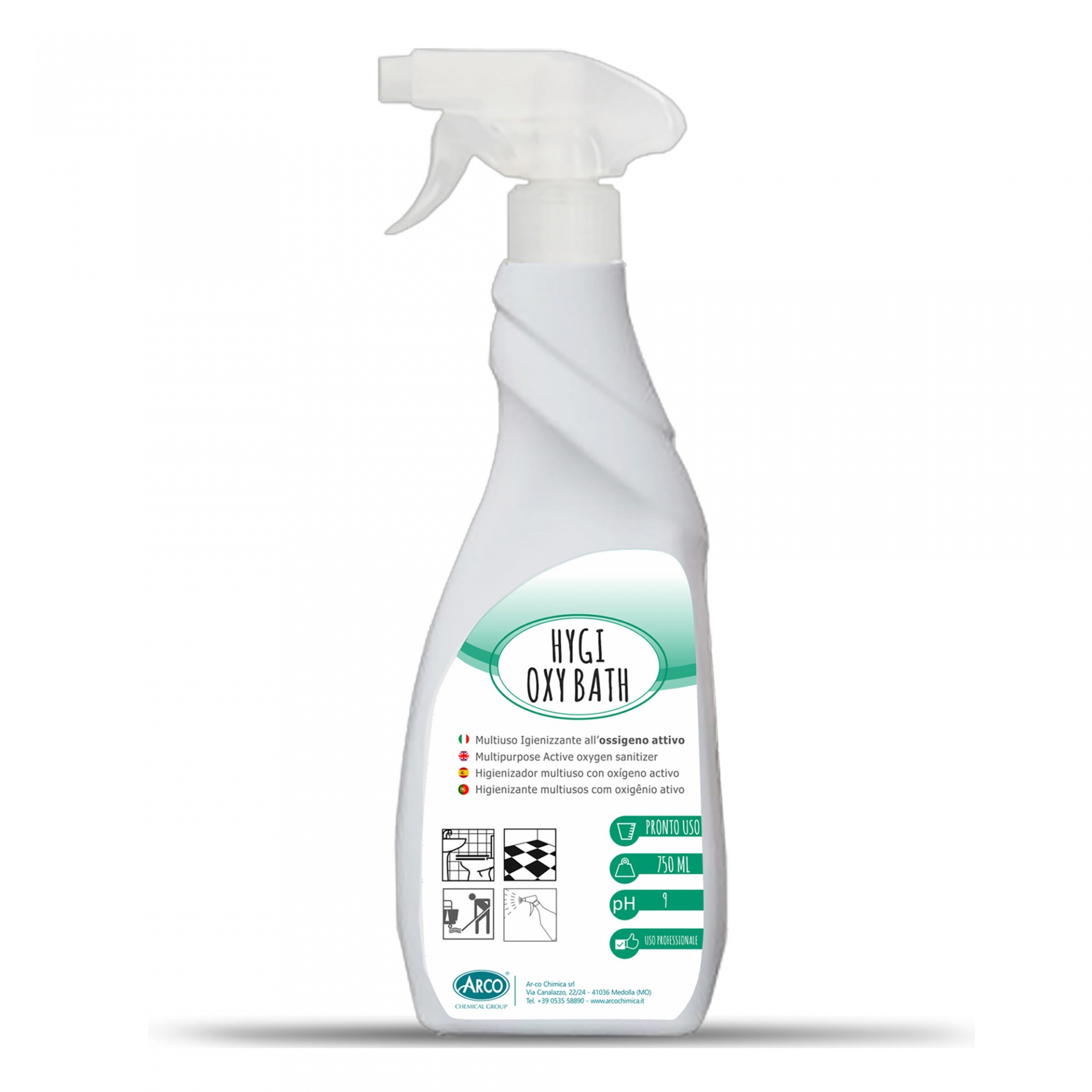 Hygi Oxy Bath é um detergente higienizante multiuso à base de oxigénio activo, adequado para a limpeza das casas de banho.