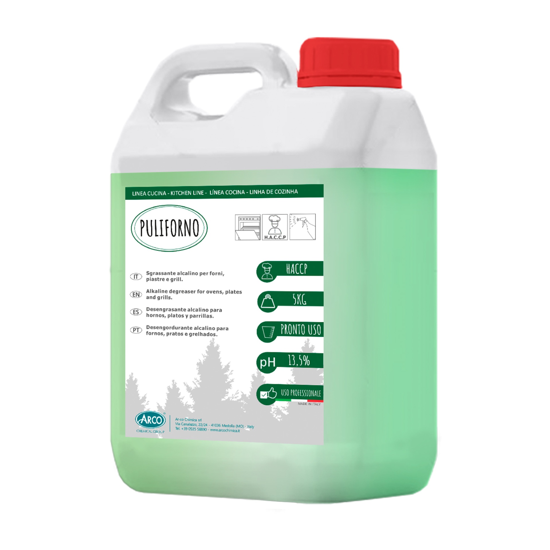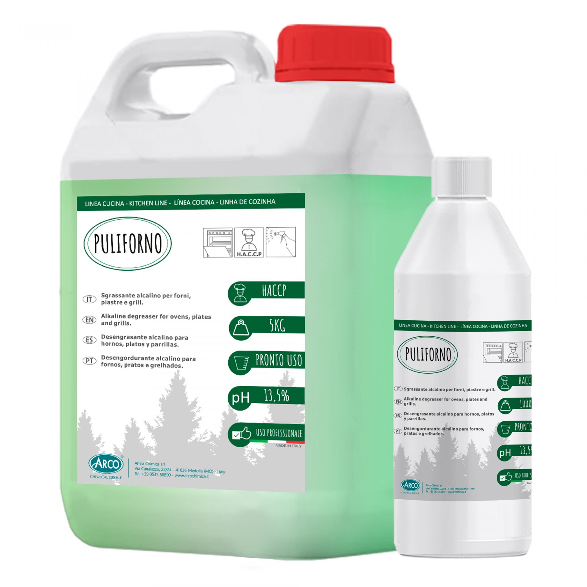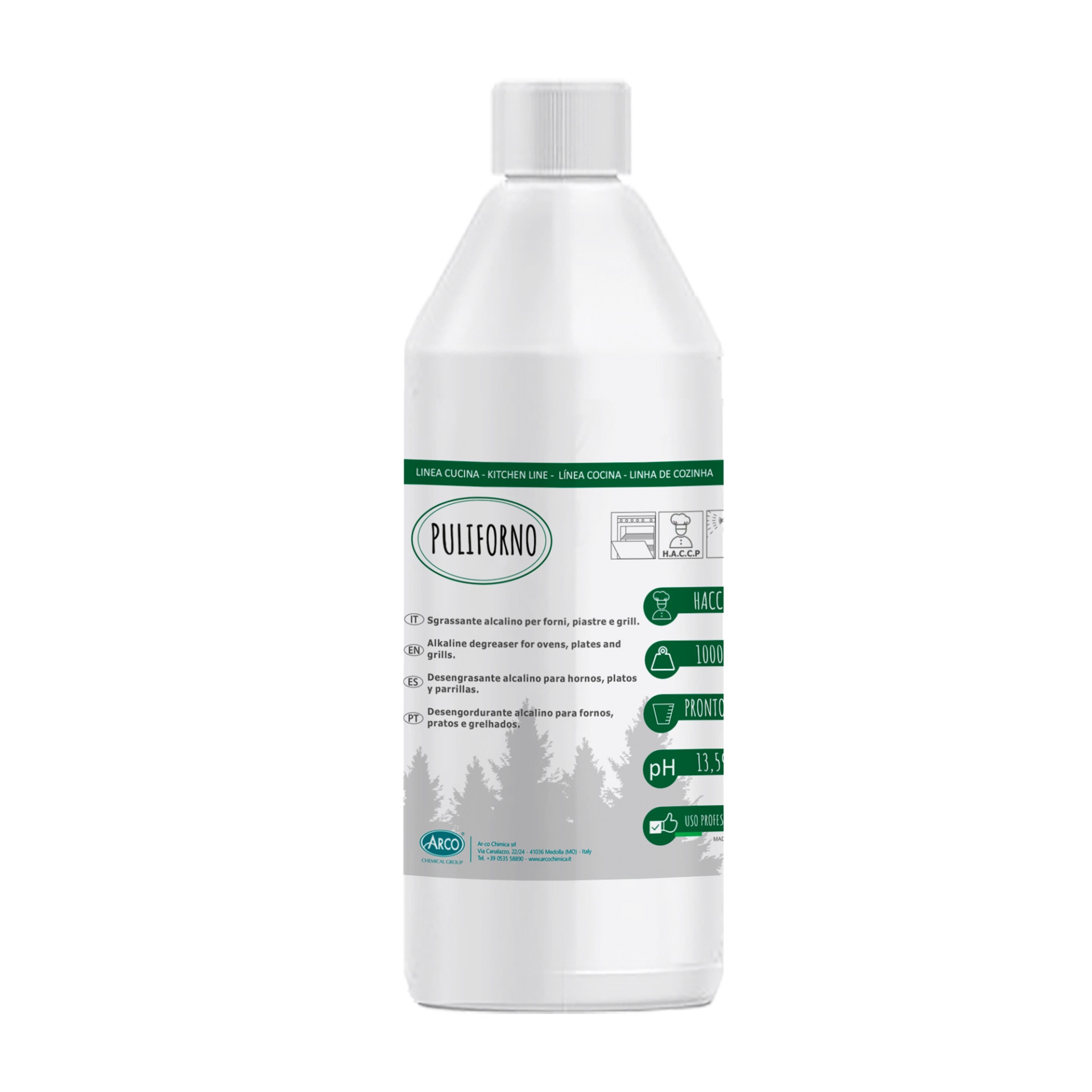 Puliforno é um desengordurante alcalino indicado para fornos, fogões, placas de cozinha etc. que solubiliza rapidamente os depósitos de sujidade gordurosa, mesmo se misturados com incrustações de resíduos de carvão.