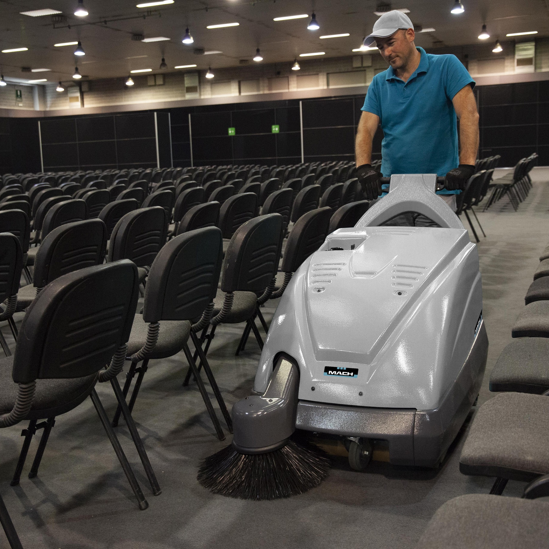 Varredora aspiradora de condutor apeado, com grande produtividade, muito eficiente e com dimensões compactas.