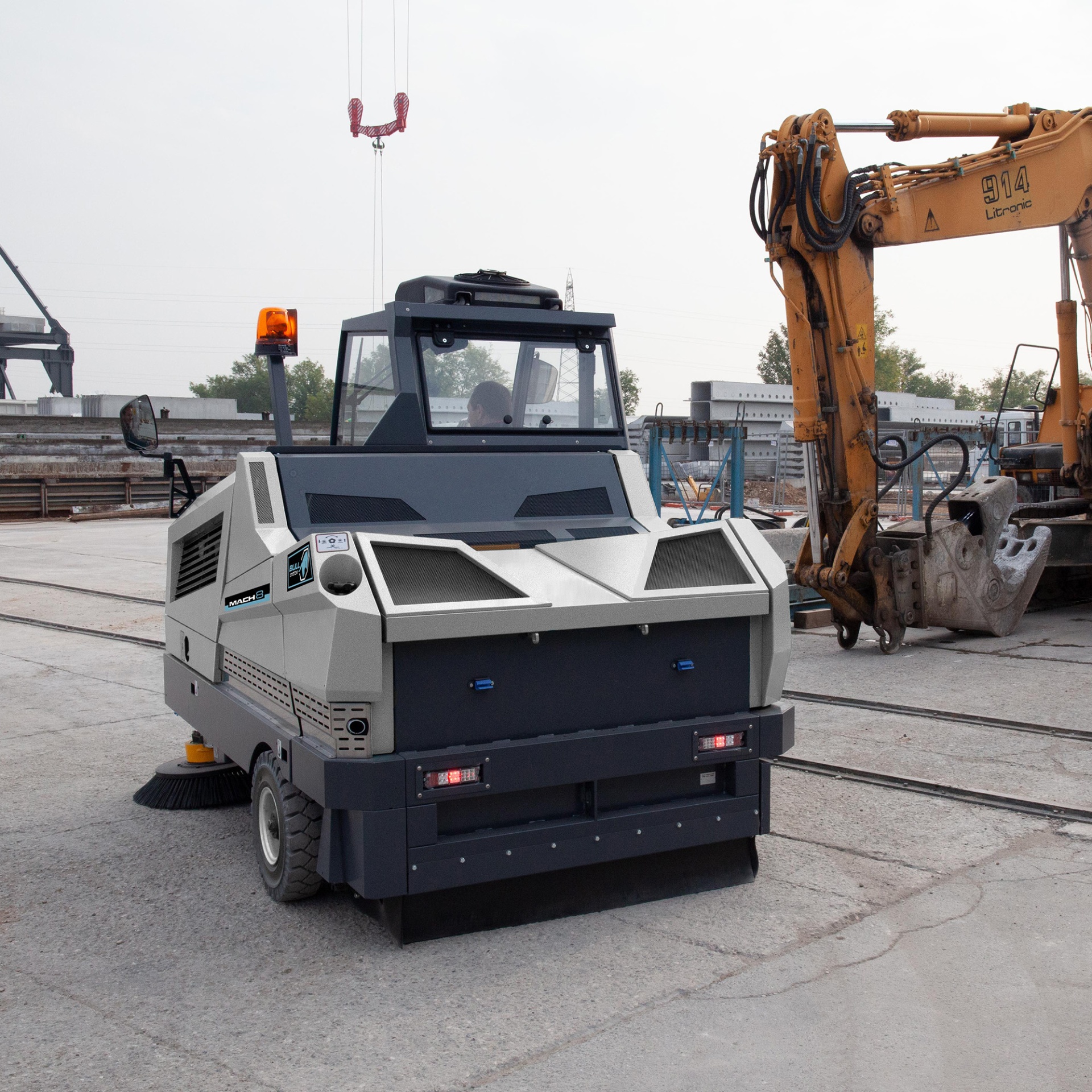 Varredora aspiradora de condutor sentado a diesel, extremamente robusta, resistente, potente e com uma elevada capacidade de trabalho. Ideal para grandes áreas extremamente empoeiradas.